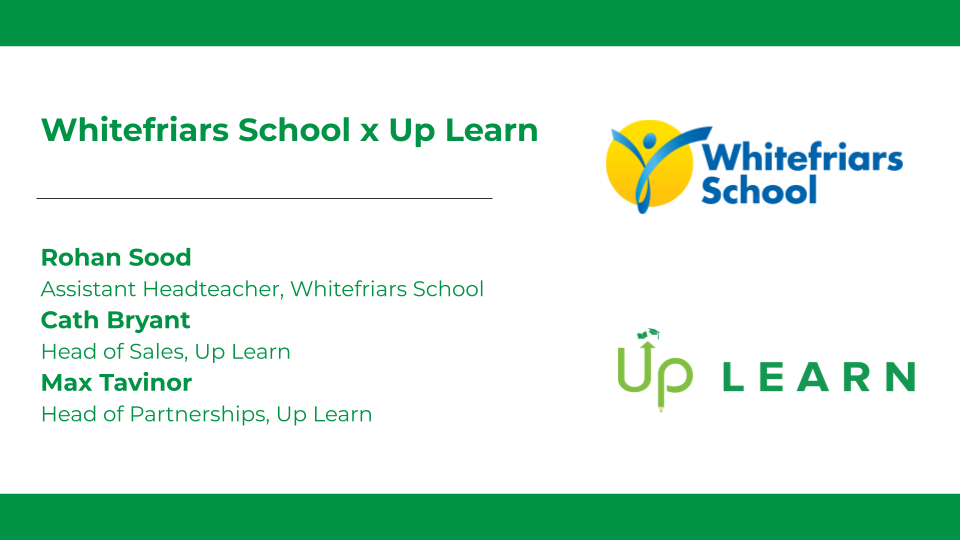 Watch this 30 minute on demand webinar with Rohan Sood (Assistant Headteacher, Whitefriars School), Cath Bryant (Head of Sales, Up Learn) and Max Tavinor (Head of Partnerships, Up Learn).